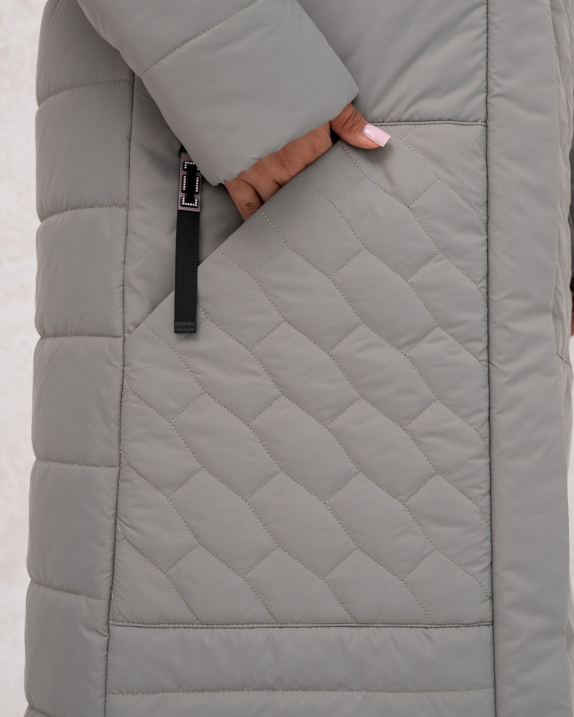 Langer Damen-Wintermantel mit Kapuze. Cleanes Design, hoher Kapuzenkragen, verdeckter Front-Reißverschluss mit Windleiste und praktische Taschen. Wadenlange Silhouette.