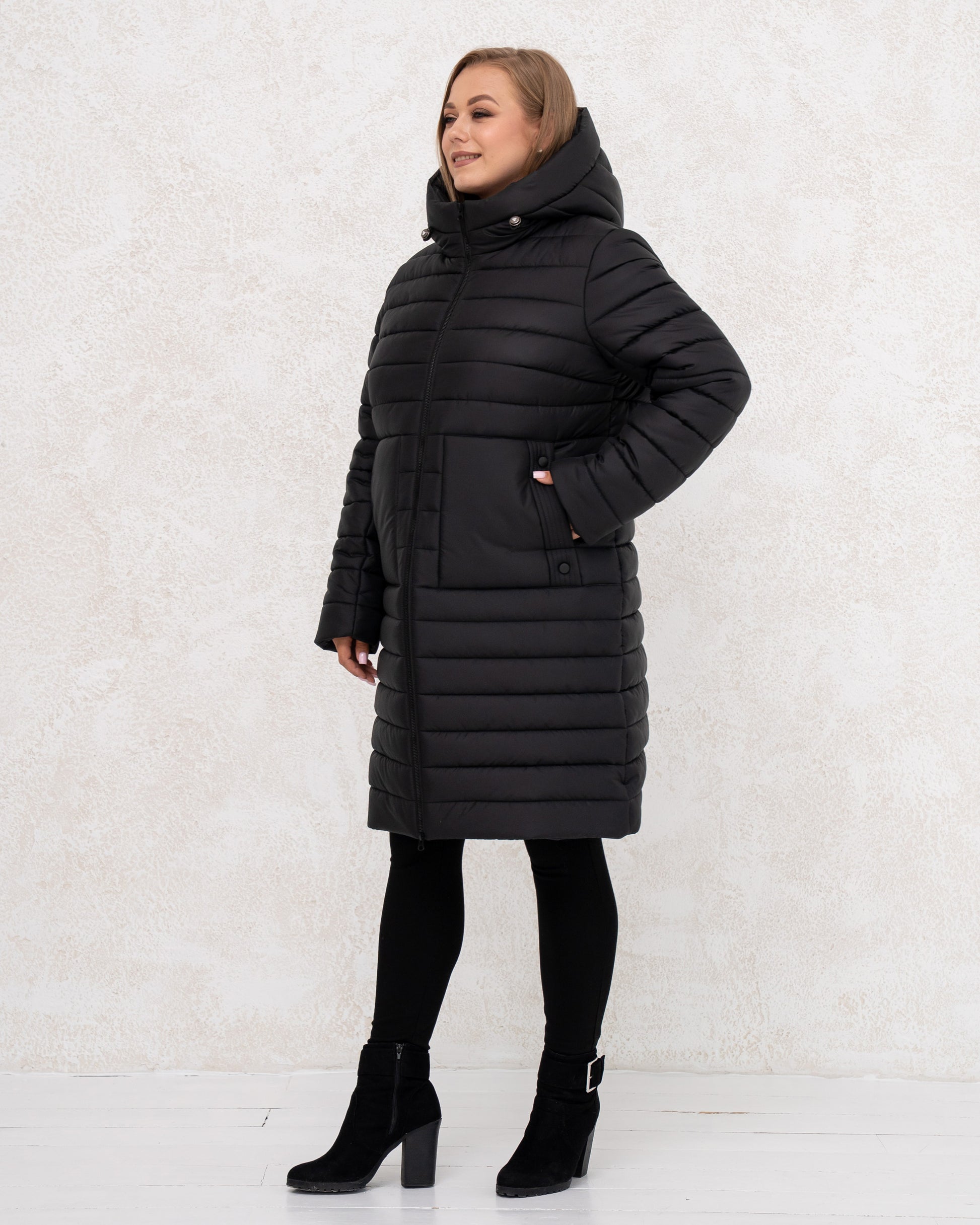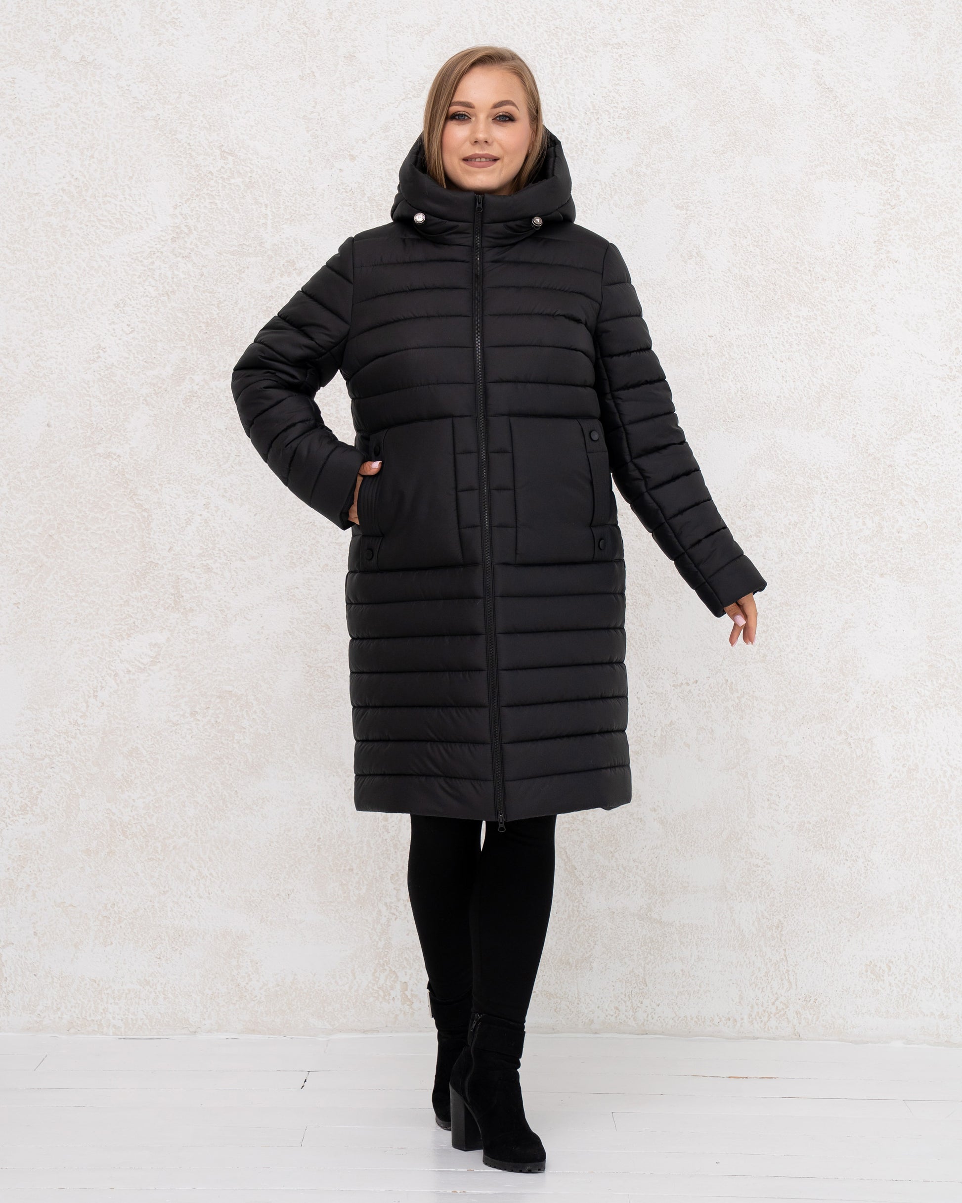 Warme Alltagsjacke mit hohem Kragen-Kapuze und gerader Silhouette. Horizontale Steppung, große warme Taschen mit Patten und Druckknöpfen. Der neutrale Farbton lässt sich leicht kombinieren.